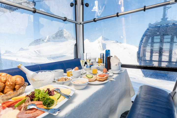Zünftig in der Gondel frühstücken und genießen! Münchner Weißwürste, resche Brezen und Erdinger Weißbier sind für dich bereits vorbereitet!